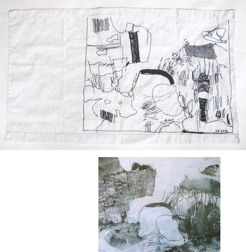 Stickerei – Zyklus auf Leinen von Erika Ruhmke . Nicht die erste Handarbeit . 43 x 76 cm . 2012